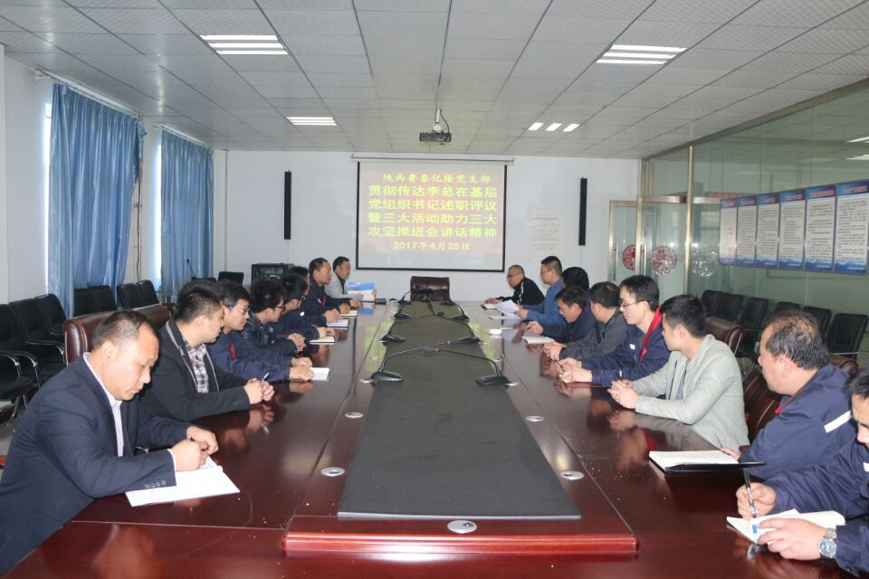 4月25日,陕西鲁泰党总支结合"两学一做"学习教育,组织各党支部认真学习集团公司基层党组织书记述职评议暨"三大活动"、助力"三大攻坚"推进会精神。